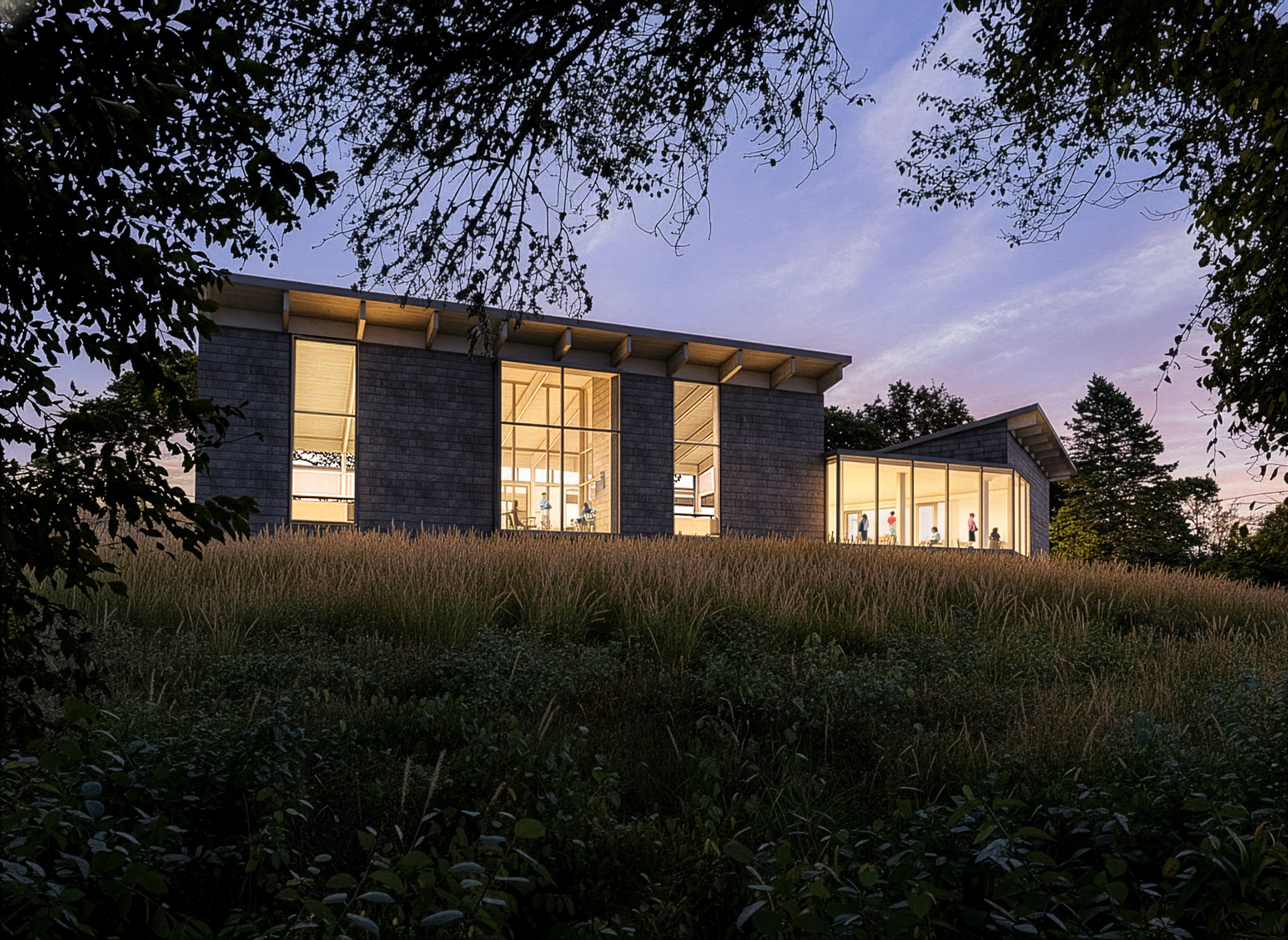 The proposed facility will be an all-electric, net-zero–ready building featuring an exposed mass timber structural system, a 3,000 square foot roof-mounted photovoltaic array, and a flexible multi-purpose community space. Expansive pond-facing glazing will provide abundant natural light and visual connection to the surrounding landscape, while a shared outdoor reading porch—situated between the adult and children’s areas—will support intergenerational use and programming. Site improvements will include expanded parking, dedicated outdoor programming areas, on-site stormwater management, and wetlands remediation designed to enhance water quality in Mill Pond. Sustainability strategies will be intentionally visible and integrated into the building’s design, positioning the library itself as an educational resource and a model of environmental stewardship and resiliency.