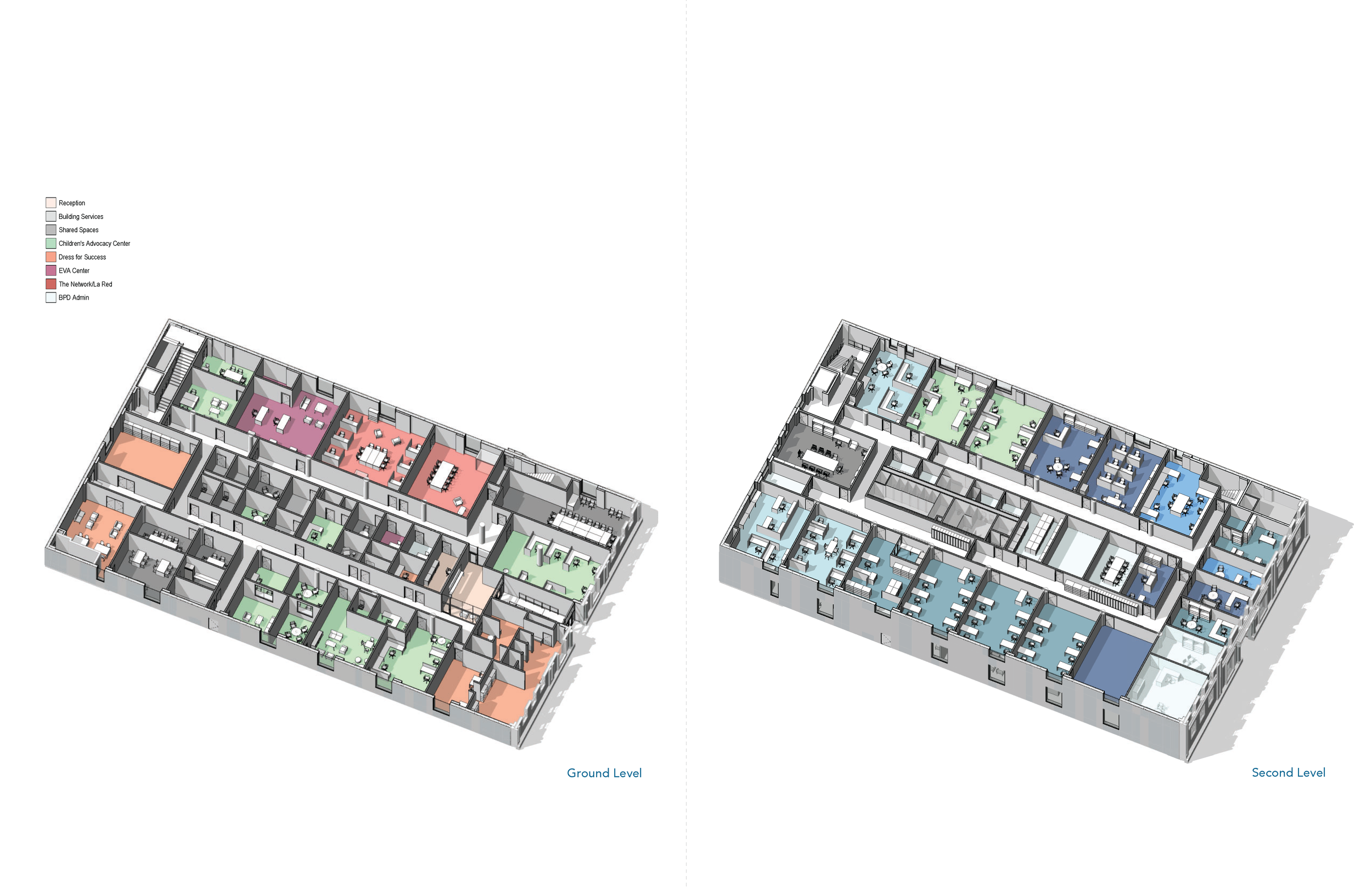 Three-dimensional diagrams showing a standardized floorplan for theoretical occupants. Full height glazing at entries and meeting spaces and clerestory windows along the corridor significantly alter the proportion of solid wall, making the building brighter, more open and inviting. The entry sequence has been transformed.