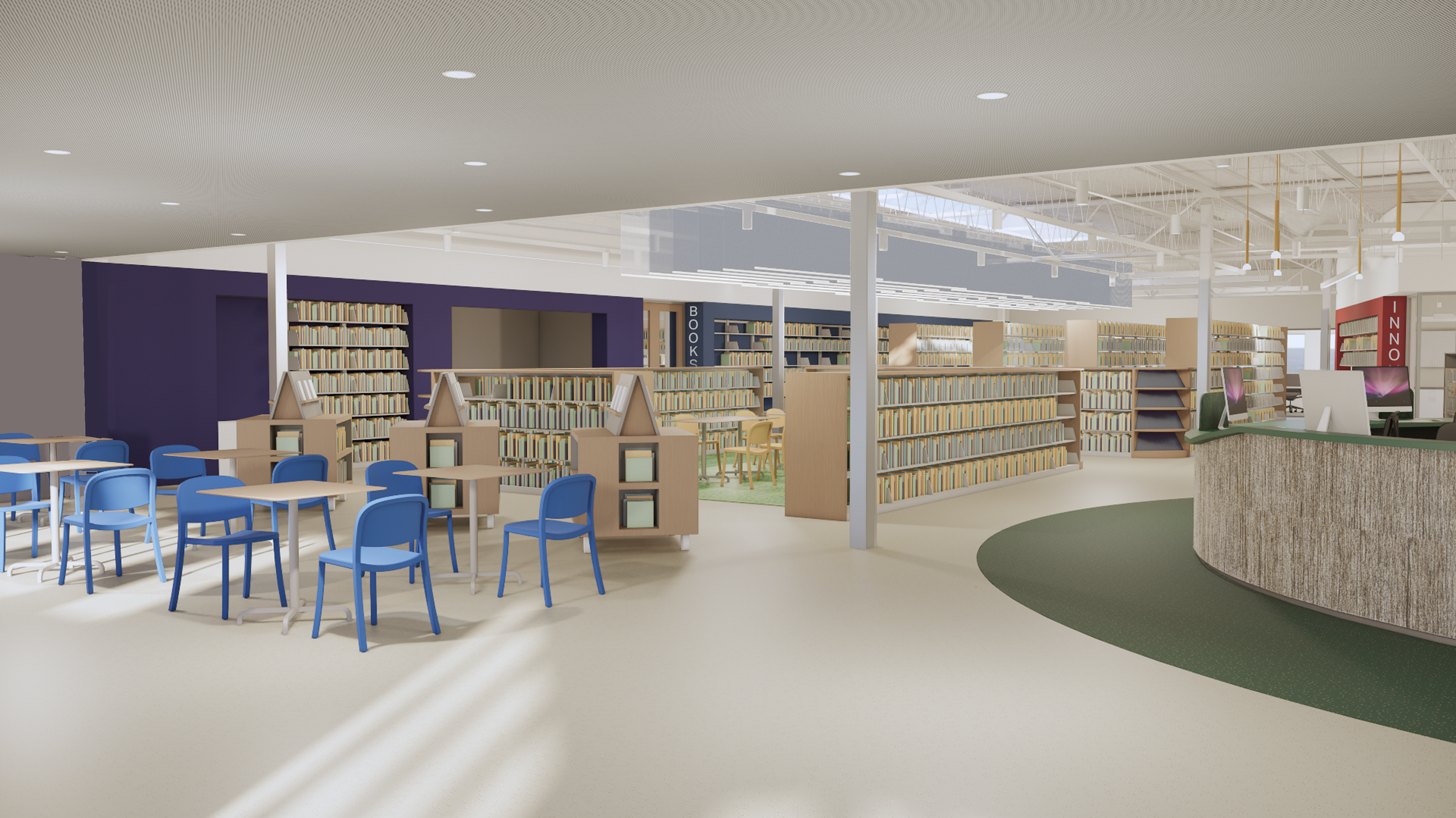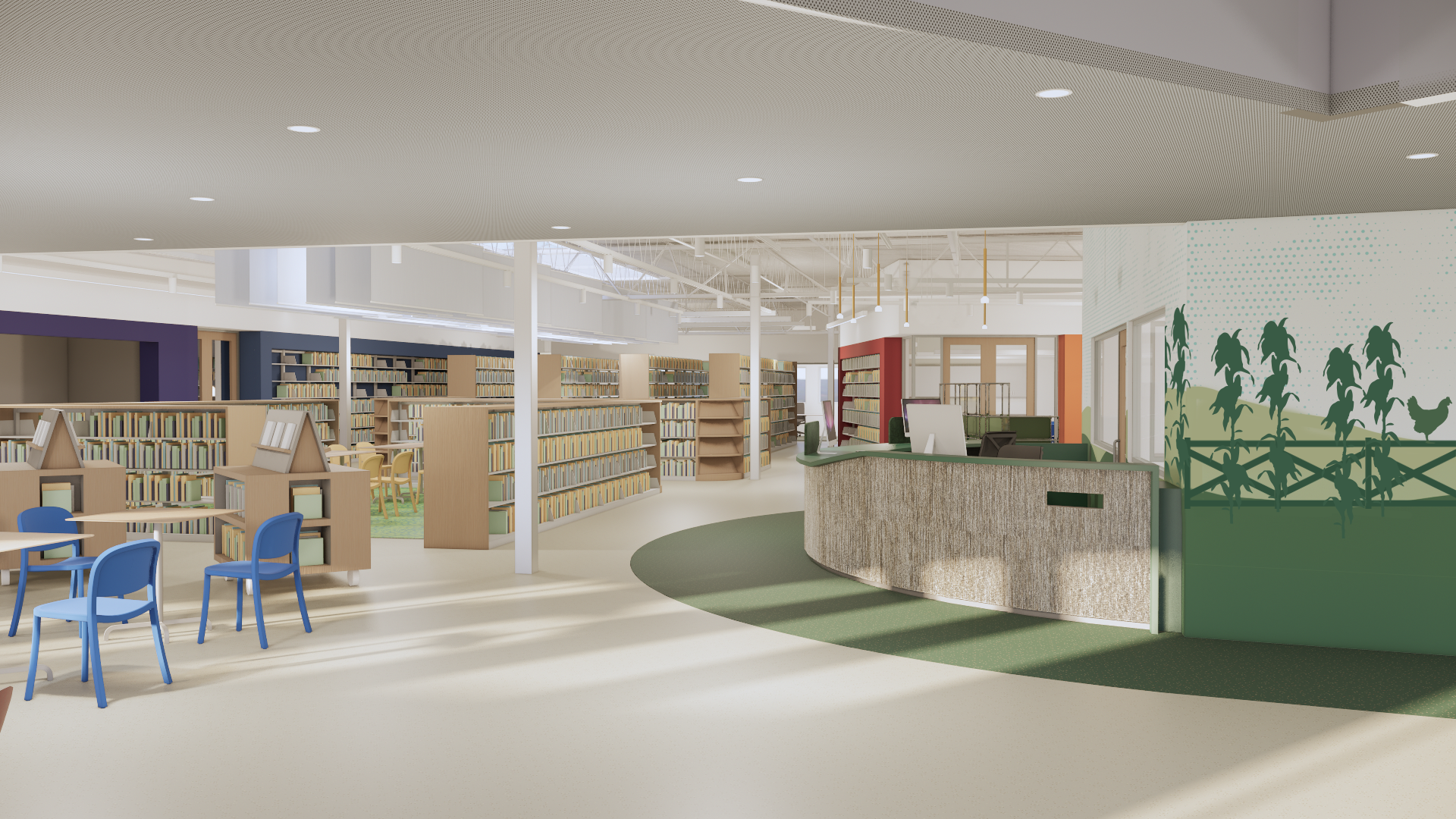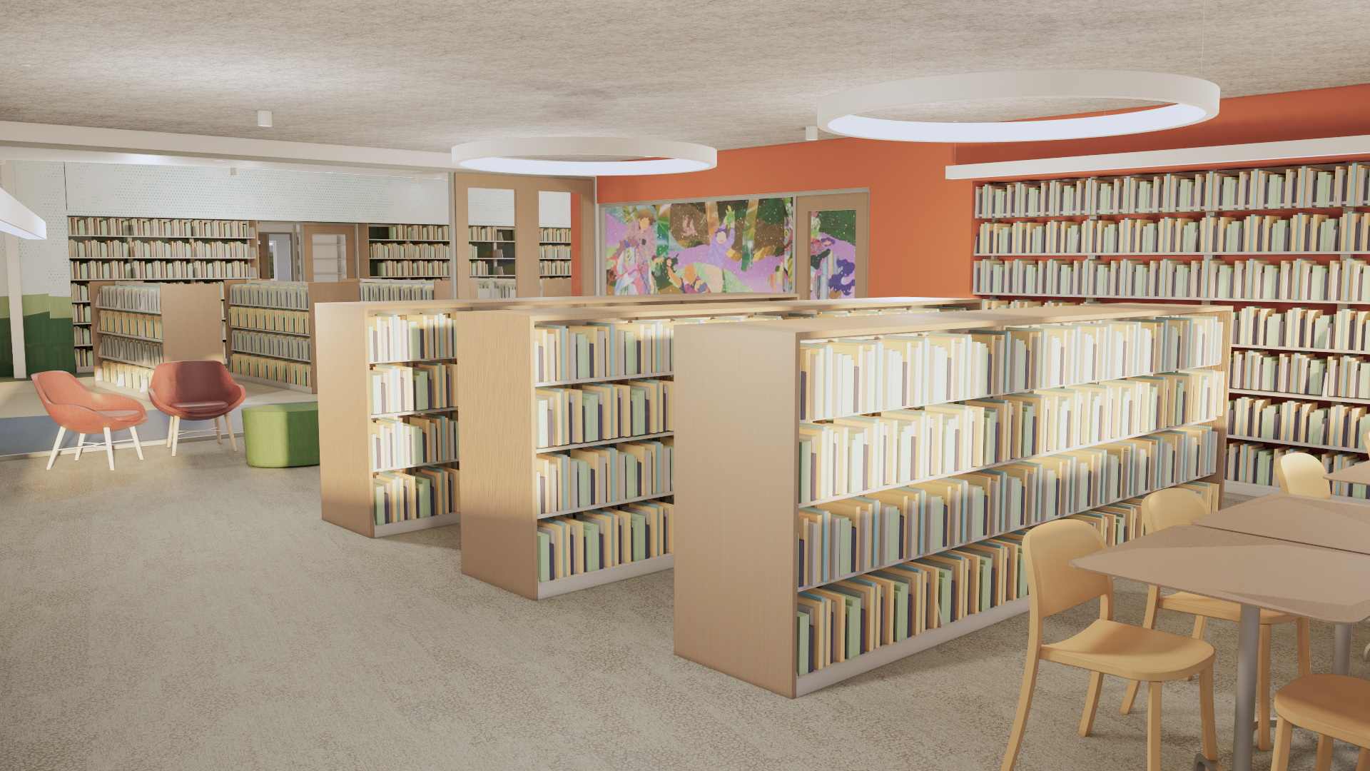 Designed with sustainability, accessibility, and safety in mind, the new library will feature improved sightlines, abundant natural light, and comfortable spaces for reading, studying, and gathering. Warm materials, vibrant colors, and thoughtful details will give each area its own unique character and sense of belonging.