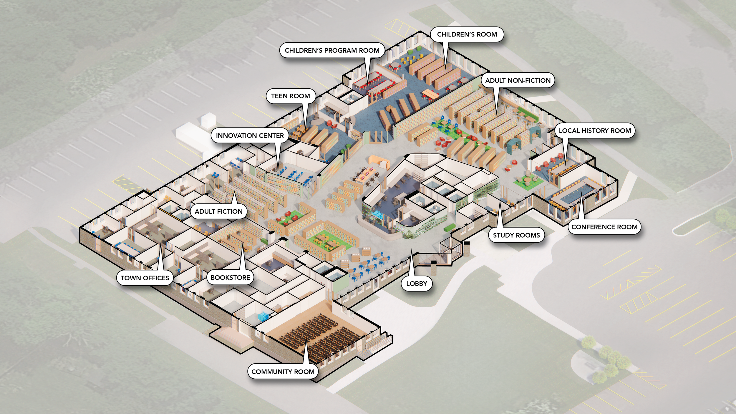 The renovation will transform the existing building into a bright, open, and welcoming environment that supports the library’s mission—to provide free access to information, materials, and programs both within and beyond its walls.