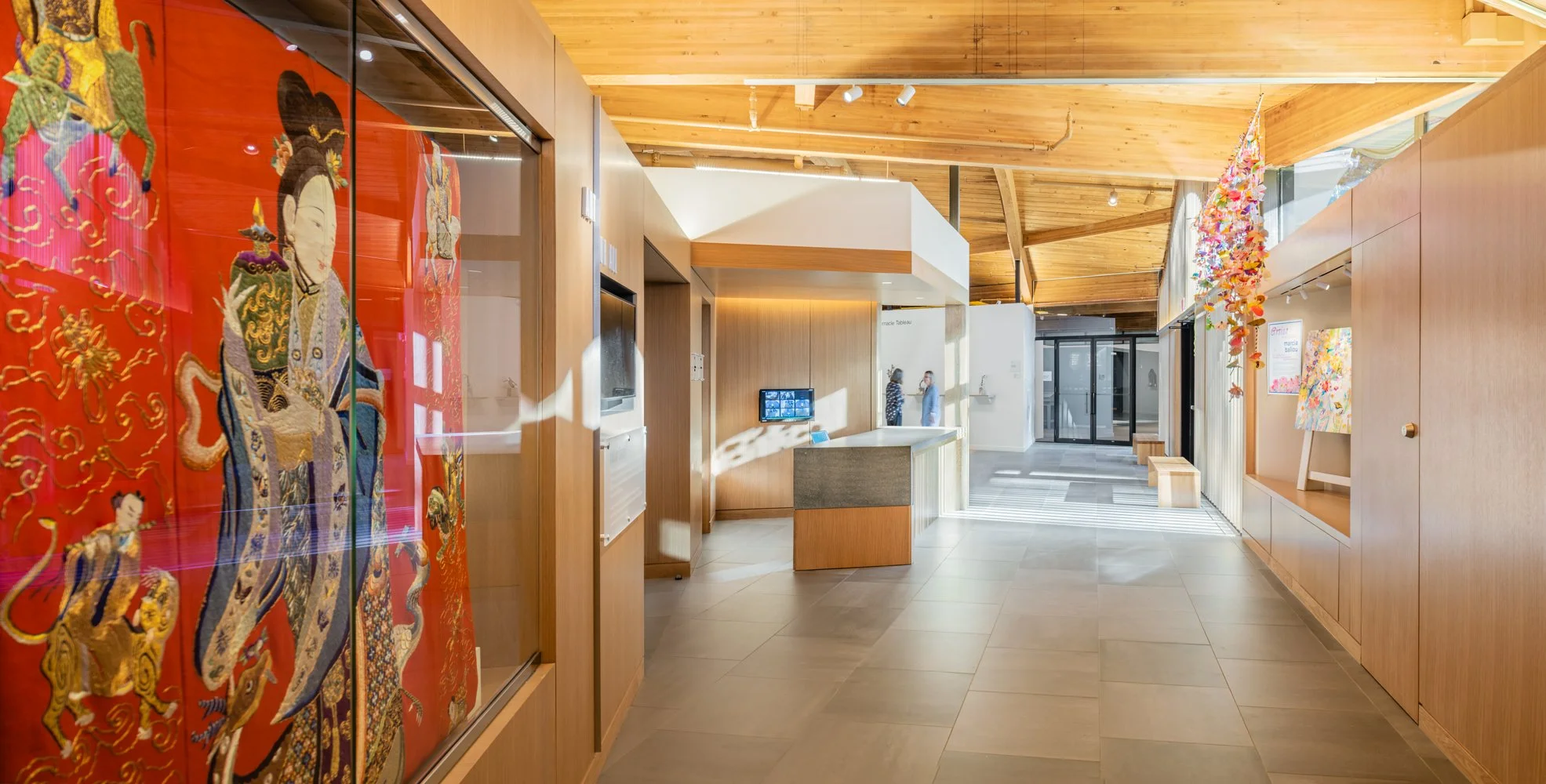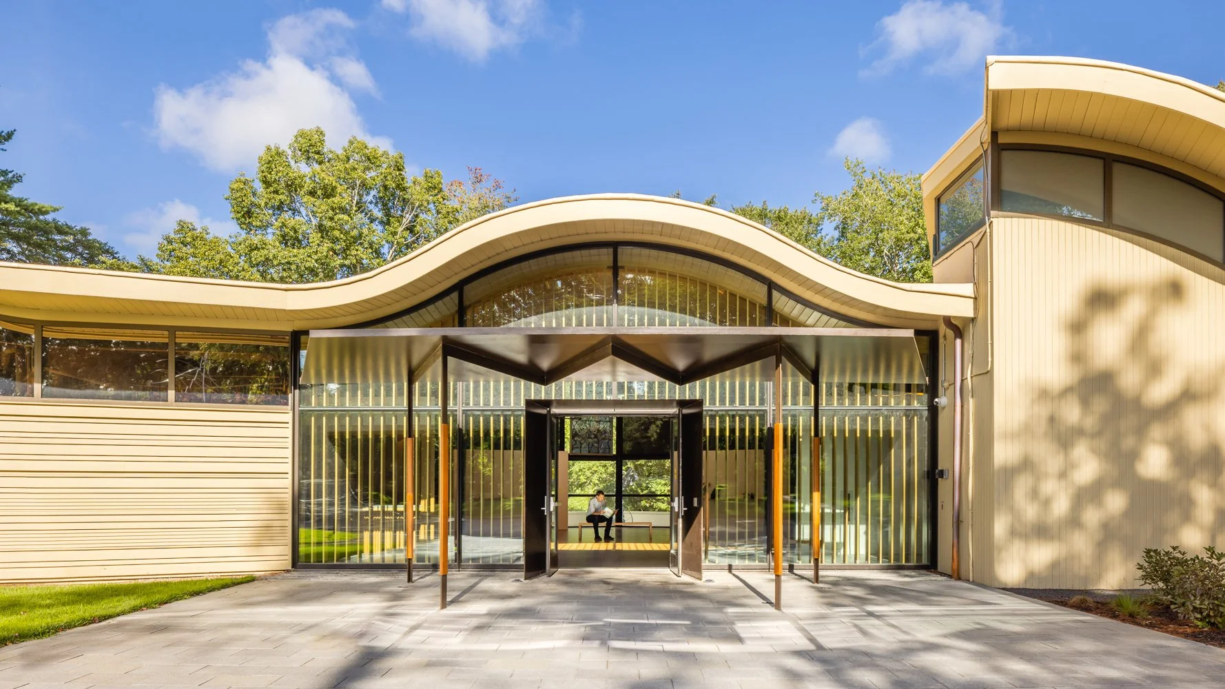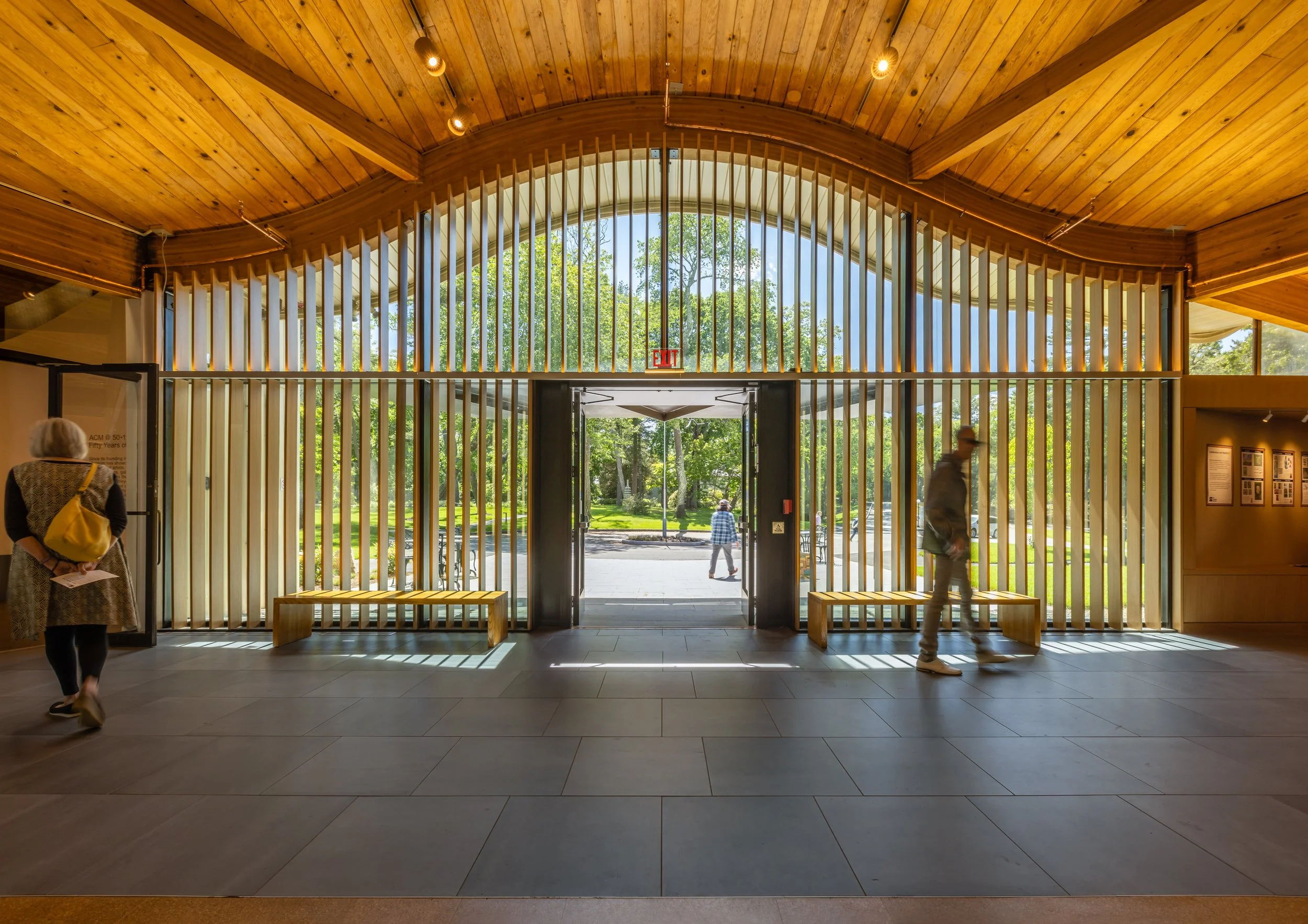 OEA was hired in 2019 to create a more transparent and welcoming main entrance, improve and expand visitor services, increase gallery and collection storage space, provide adequate administrative space, and perform building-wide code and accessibility upgrades. The most visible improvement to the museum is its new entrance which transforms the previously dark, opaque entrance to a transparent, welcoming new first impression for visitors featuring a new custom-fabricated, freestanding, welded steel plate canopy structure and new entry plaza. The canopy was designed to be as visually light as possible so as not to compete with the overall aesthetic of the original building. Fixed heavy canvas shades on the entrance's interior were replaced with a slatted wood screen which, along with the canopy, helps mitigate the museum's challenging west orientation. Visitor services were expanded with a more gracious lobby, a new information desk, new accessible public restrooms and improved access to gallery space. Renovations also include a new HVAC system, a new sprinkler system and new lighting designed to showcase the undulating exposed timber roof.