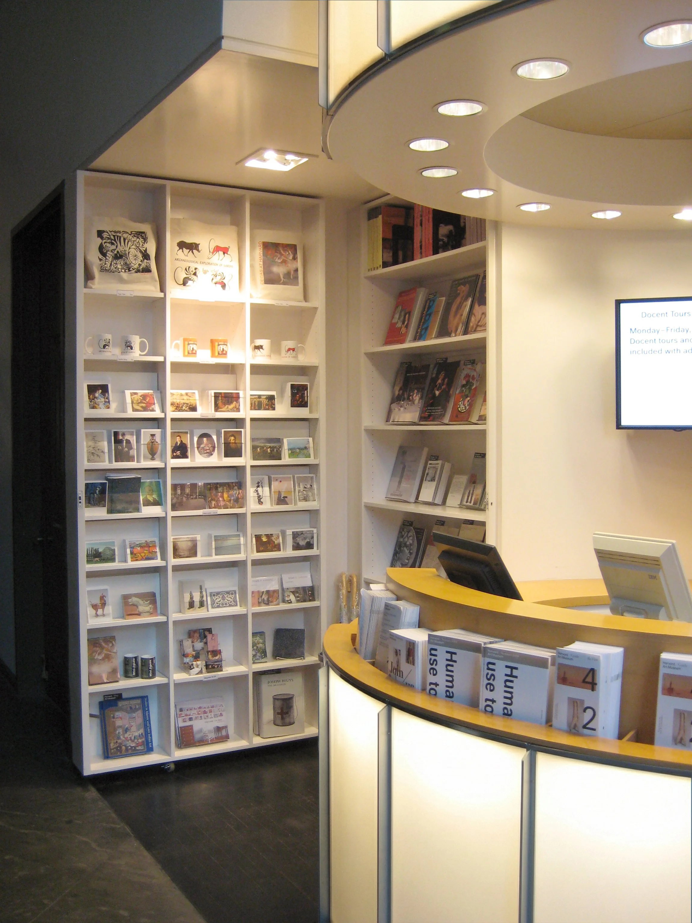 In 2008, Harvard Art Museums commissioned Oudens Ello Architecture to design a new information desk and museum shop in the lobby of the Arthur M. Sackler Museum. The current home of Harvard University’s ancient, Islamic, Asian, and later Indian art collections, the Sackler is also serving as the temporary home for many of the Fogg Art Museum’s collections during its period of major renovation and expansion over the next five years. During this transitional phase, this desk and shop is the primary information and retail operation for Harvard University Art Museums, which comprises the Sackler, the Fogg, and the Busch-Reisinger museums.