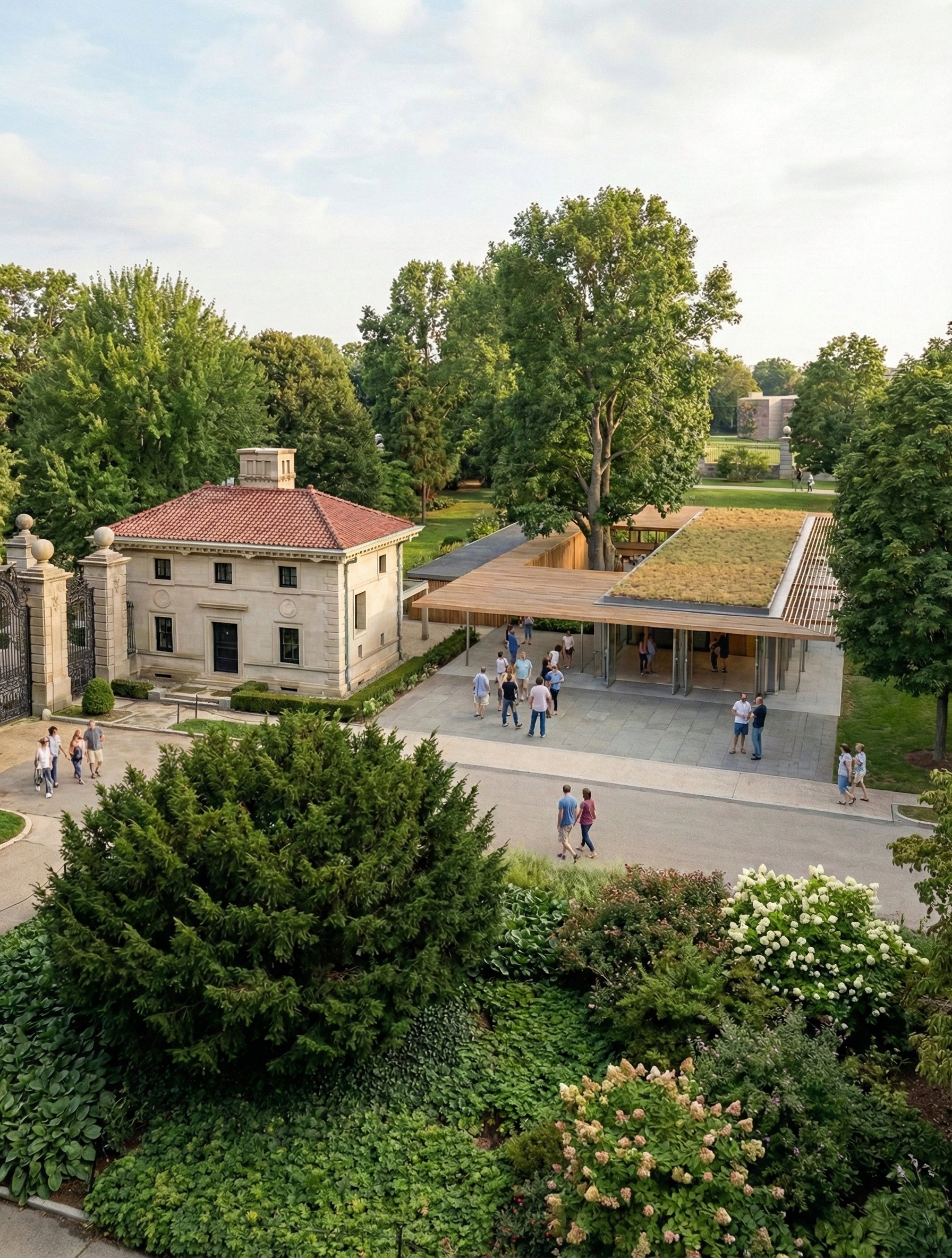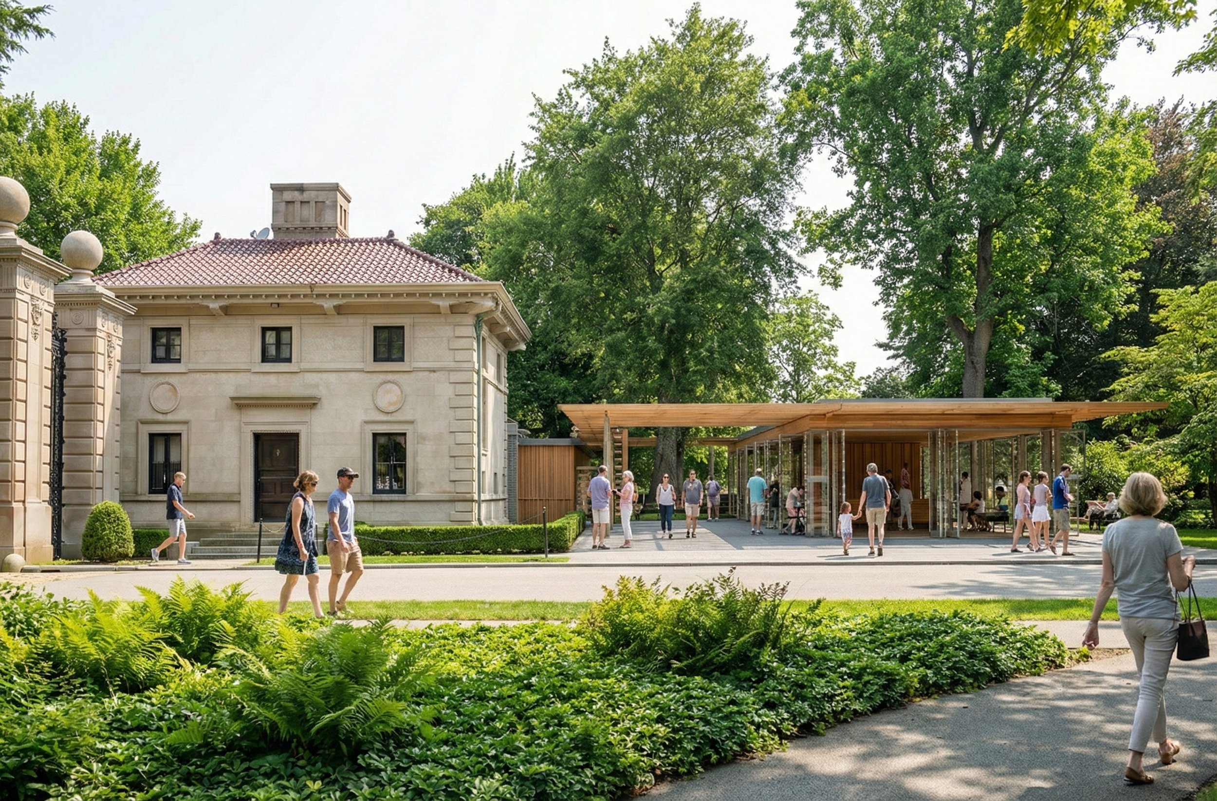 OEA’s competition proposal intentionally departed from replicating the historic limestone architecture found elsewhere on the property. Instead, the design was conceived as a light, contemporary landscape pavilion, drawing inspiration from the site’s lush, garden-like setting. Emphasizing a landscape-driven rather than building-centric approach, the proposal sought to frame the visitor experience as one that begins within the historic grounds themselves, allowing guests to engage with the property through its landscape rather than through a constructed imitation of historic architecture.