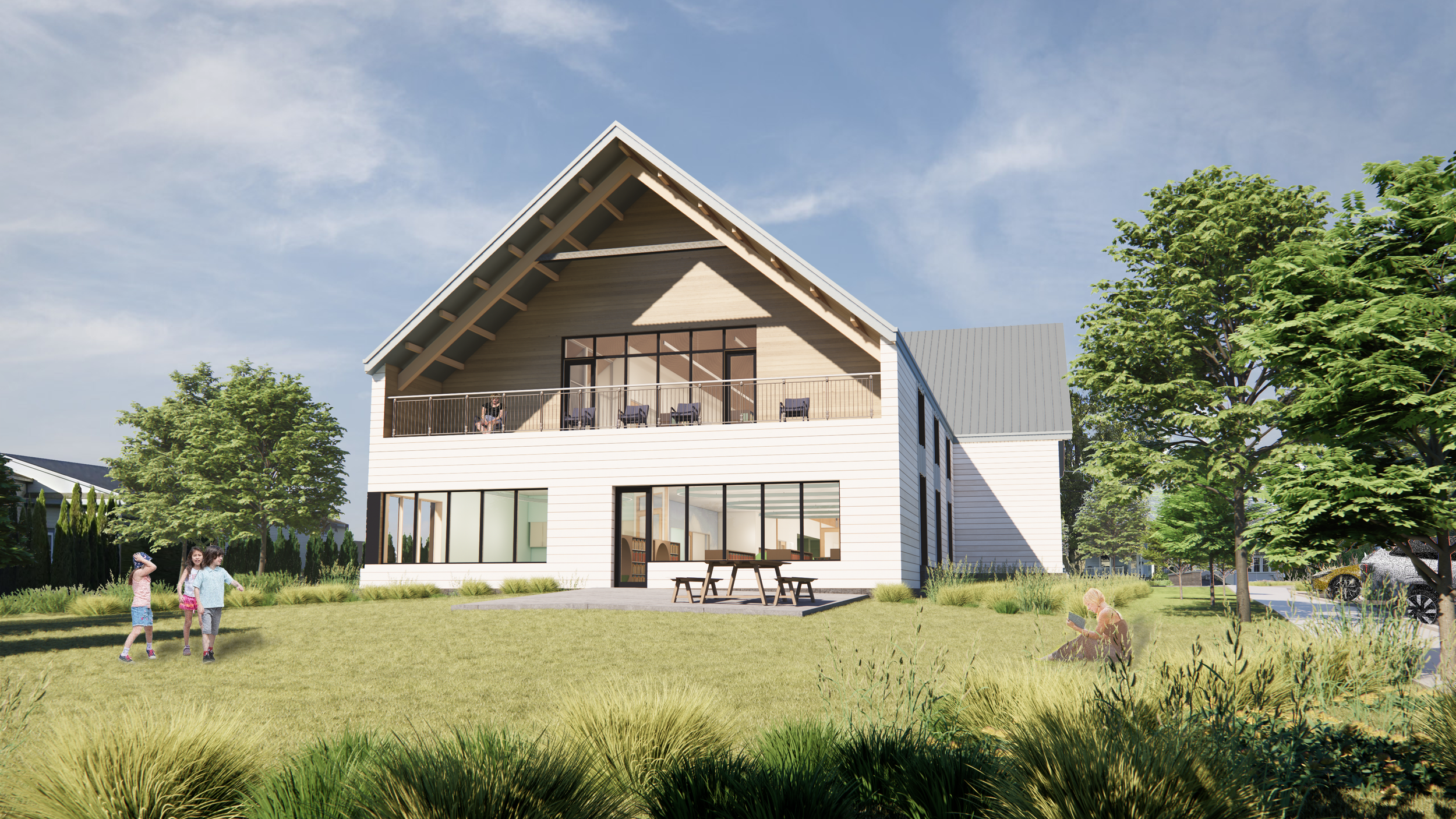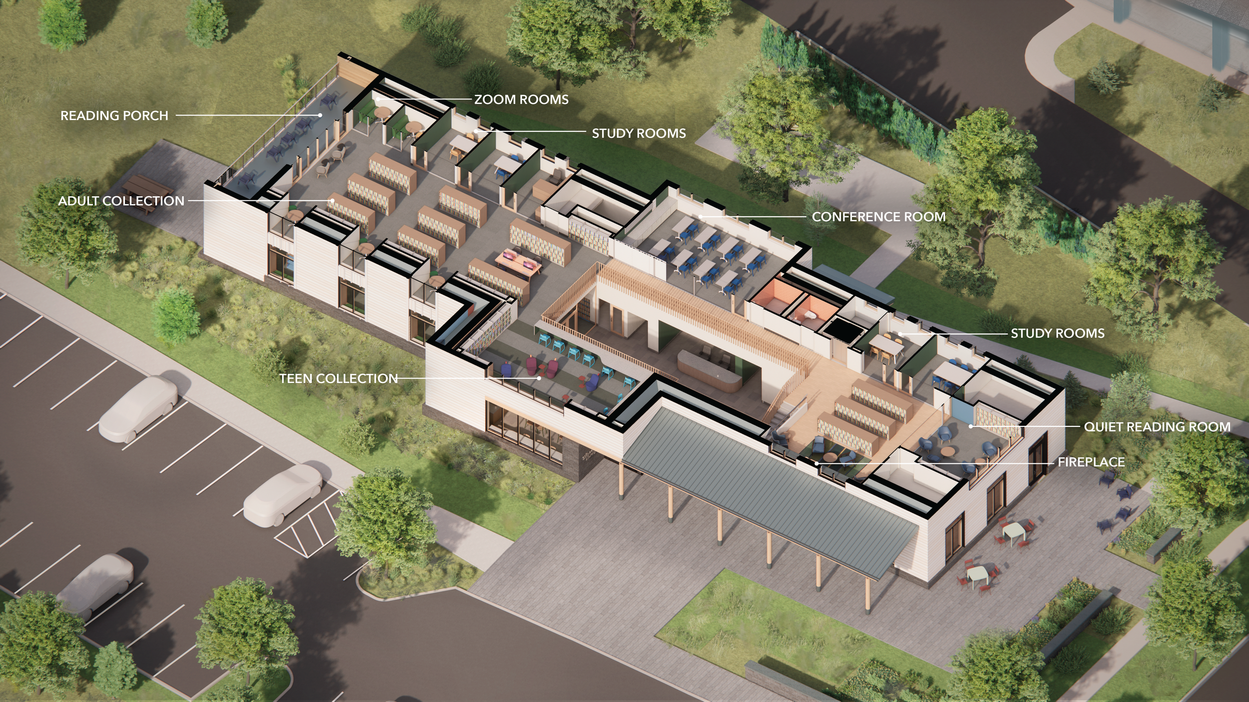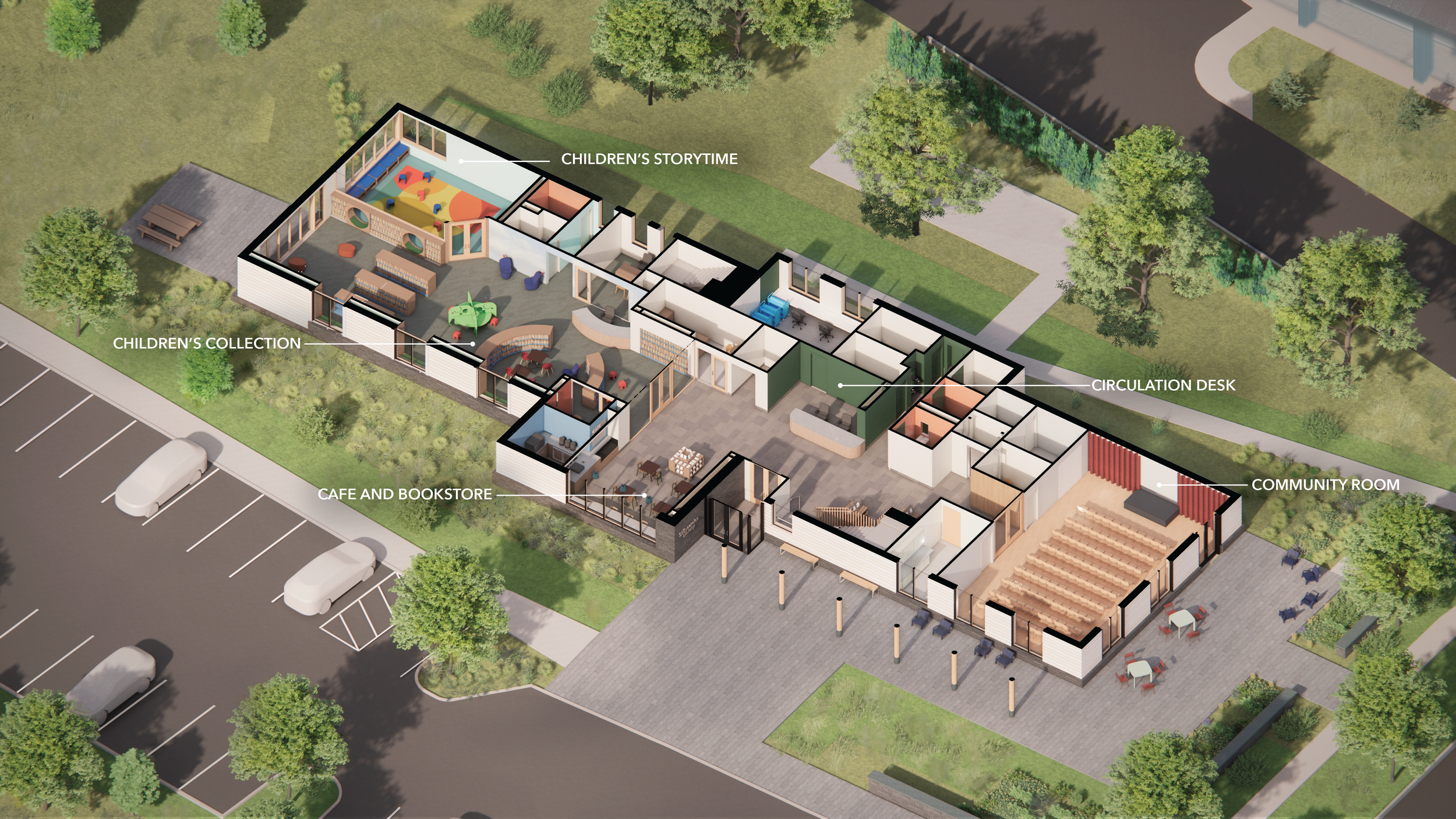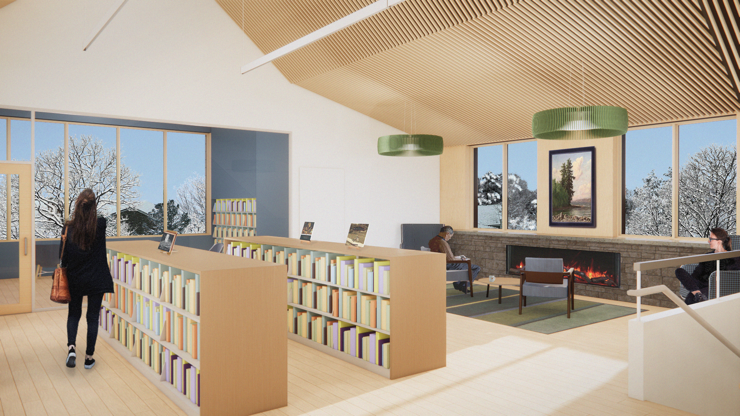 Following several years of community advocacy and site selection, a two-acre parcel within walking distance of the village center was secured to accommodate a purpose-built facility. The new library provides expanded children’s and adult collections areas, multiple flexible meeting rooms, a 100-person community room, a used book shop, and a café—positioning the building as both a contemporary library and a vibrant civic hub. The site also allows for generous public parking and outdoor programming space.