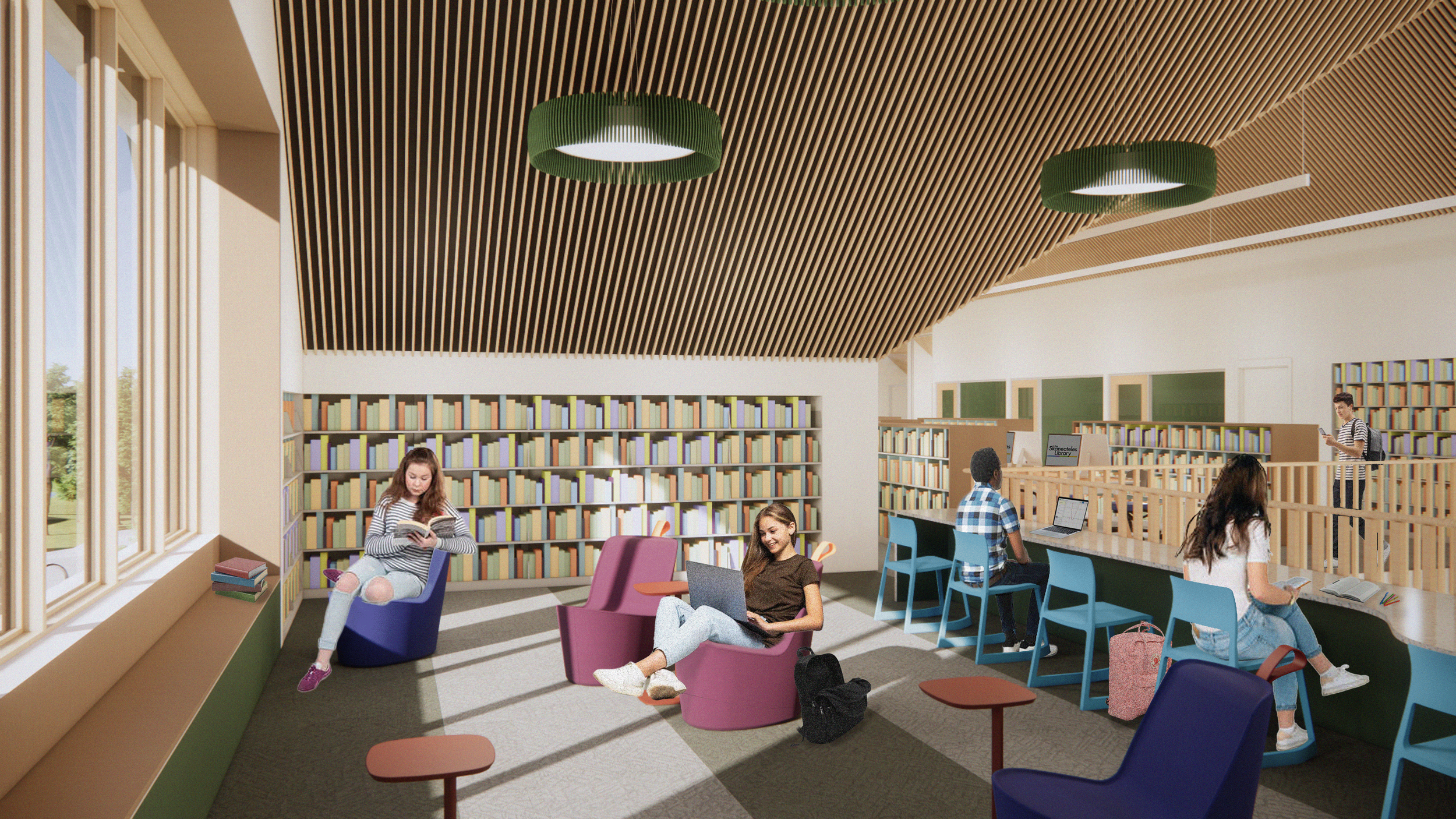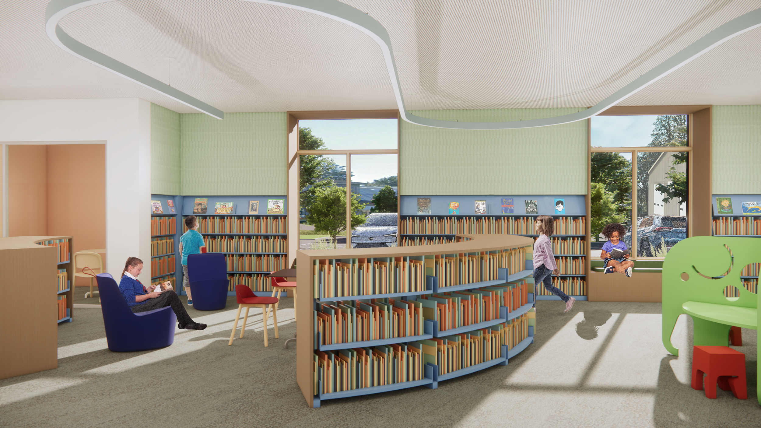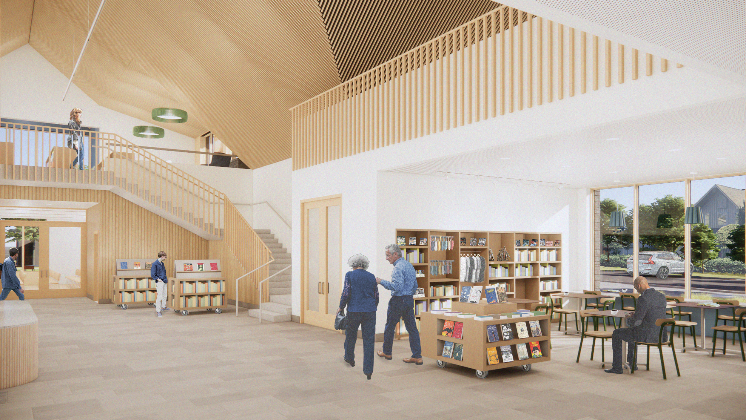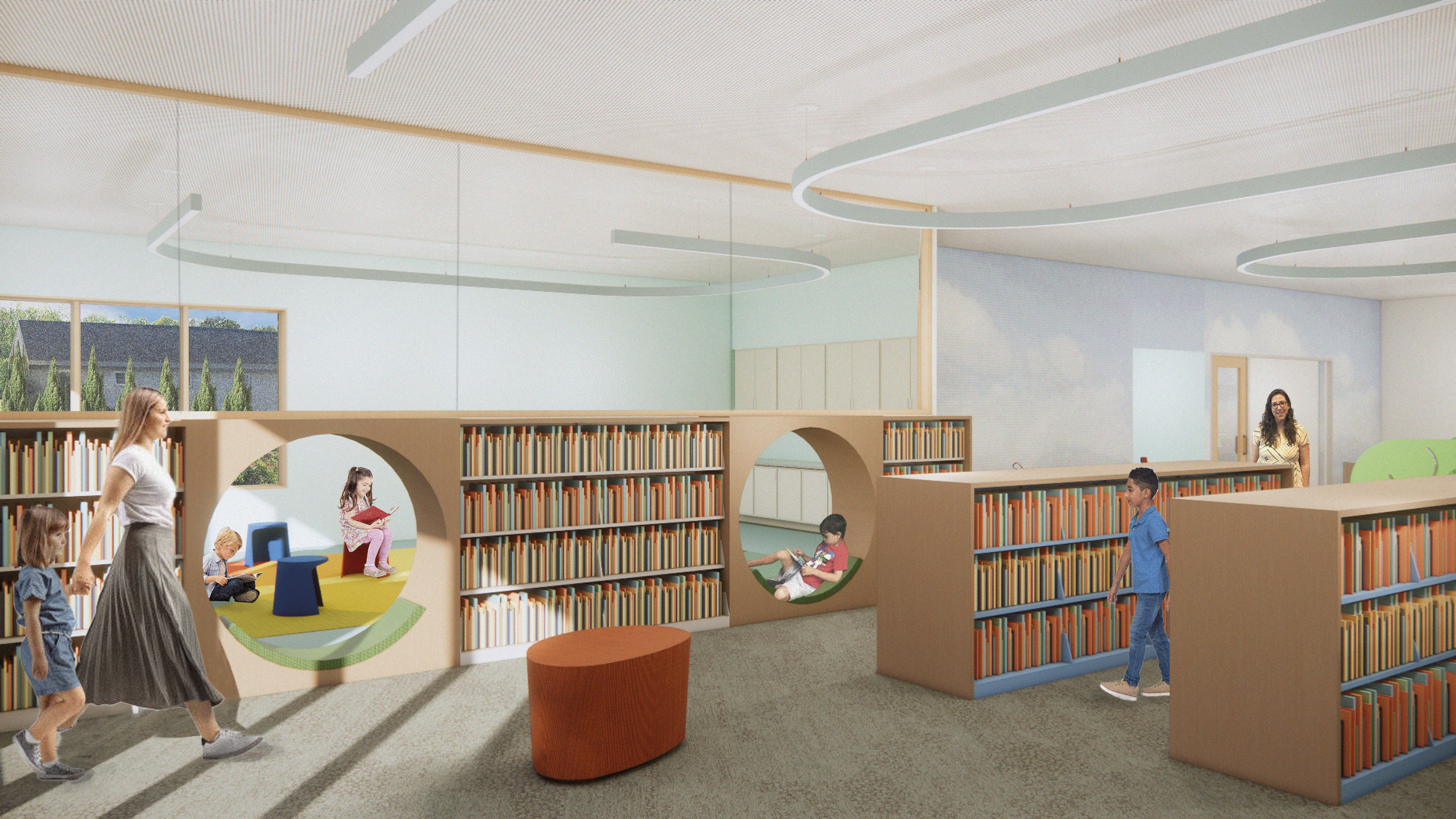 Following several years of community advocacy and site selection, a two-acre parcel within walking distance of the village center was secured to accommodate a purpose-built facility. The new library provides expanded children’s and adult collections areas, multiple flexible meeting rooms, a 100-person community room, a used book shop, and a café—positioning the building as both a contemporary library and a vibrant civic hub. The site also allows for generous public parking and outdoor programming space.