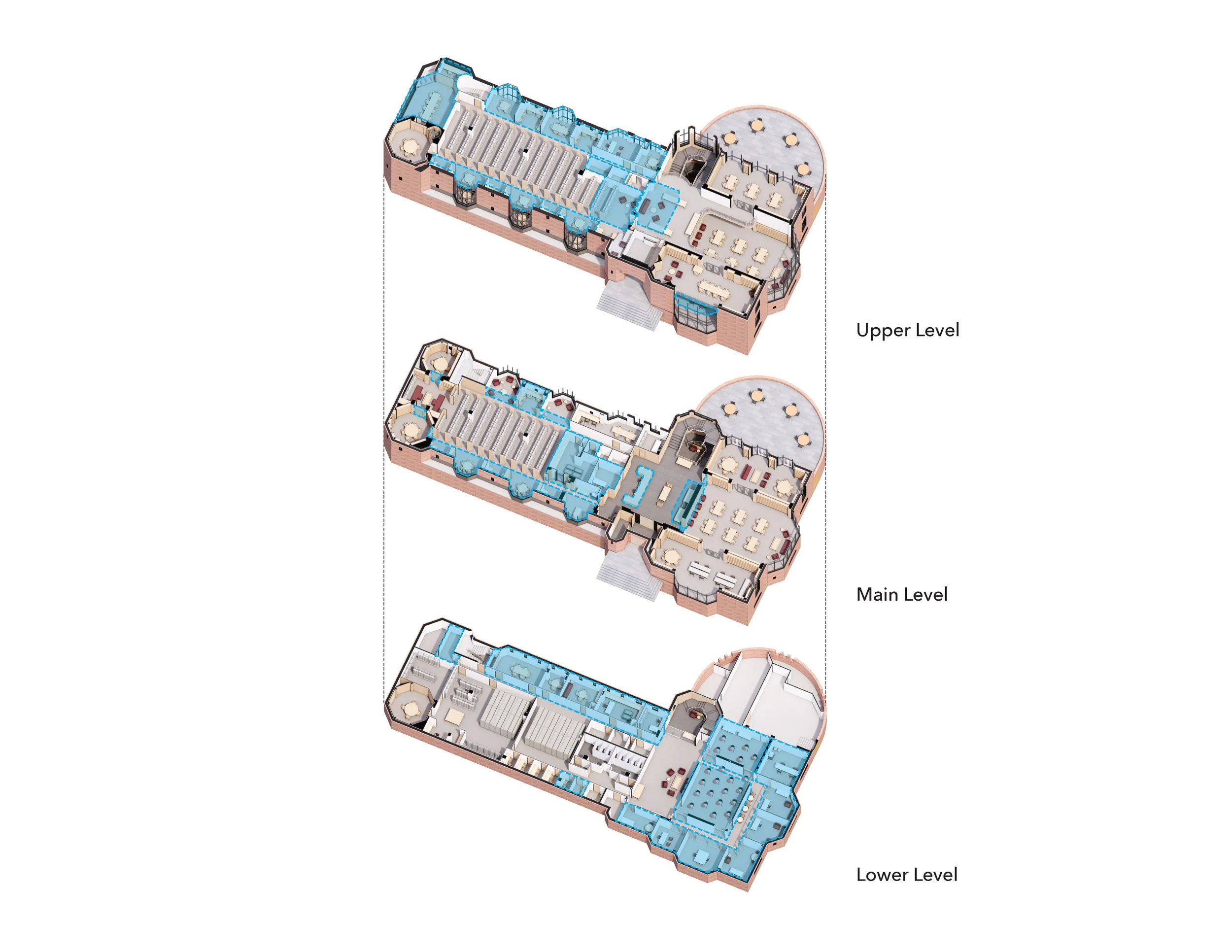 Architecturally, the study recommends targeted renovations throughout the library to expand and diversify learning environments. Proposed improvements include new private and group study rooms, flexible classrooms, lounge and wellness spaces, a makerspace, and enhanced staff work areas. Emphasis was placed on improving circulation, access to daylight, transparency, and universal accessibility, reinforcing the library’s role as an inviting and adaptable campus destination. The resulting plan establishes a clear framework for either phased or single-mobilization implementation, aligning long-term stewardship of the building with the academic mission and future needs of St. Paul’s School.