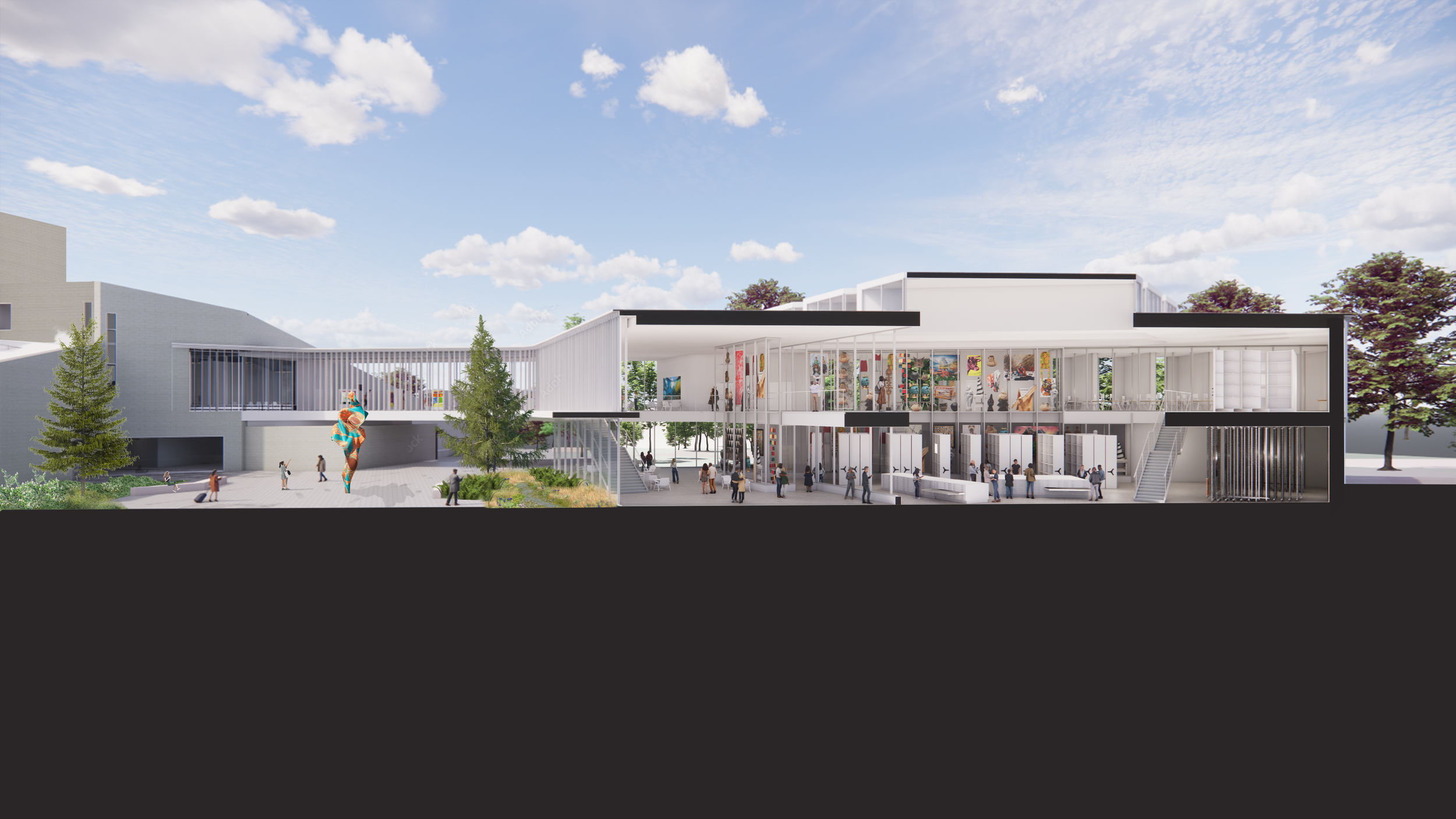 Oudens Ello Architecture (OEA) was commissioned by the Tang Teaching Museum to envision a new facility dedicated to the study, research, and long-term preservation of the museum’s collection, at the same time re-examining how collections are stored and accessed. The proposed Center for Art + Ideas places the collection at its heart, inviting visitors to experience the collections more directly. It will serve as a nexus of cultural and educational collegiate activity, situated in the park-like area between the main campus and the athletic/wellness campus. An upper-level bridge connection facilitates collection movement between the two buildings. The new facility expands the college’s teaching space with three new appropriately sized classrooms, and offers flexible use and conference center capabilities with ground level program spaces, including multi-purpose event/gallery space and 150-seat screening room, engaging a wider audience and fostering a deeper relationship between the college and the local community. The new building is not simply an extension of the Tang Teaching Museum, but rather an independent, dynamic structure with its own identity and vitality. Designed to complement and enhance the museum’s mission, it also serves as a vital asset to the broader college community, contributing to Skidmore’s academic infrastructure with flexible environments for teaching, learning, and collaboration.