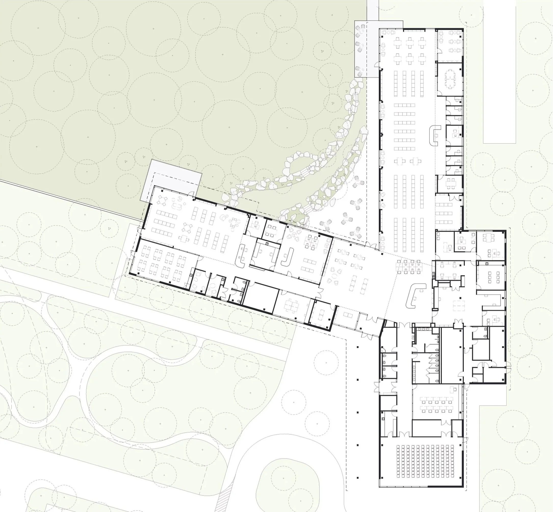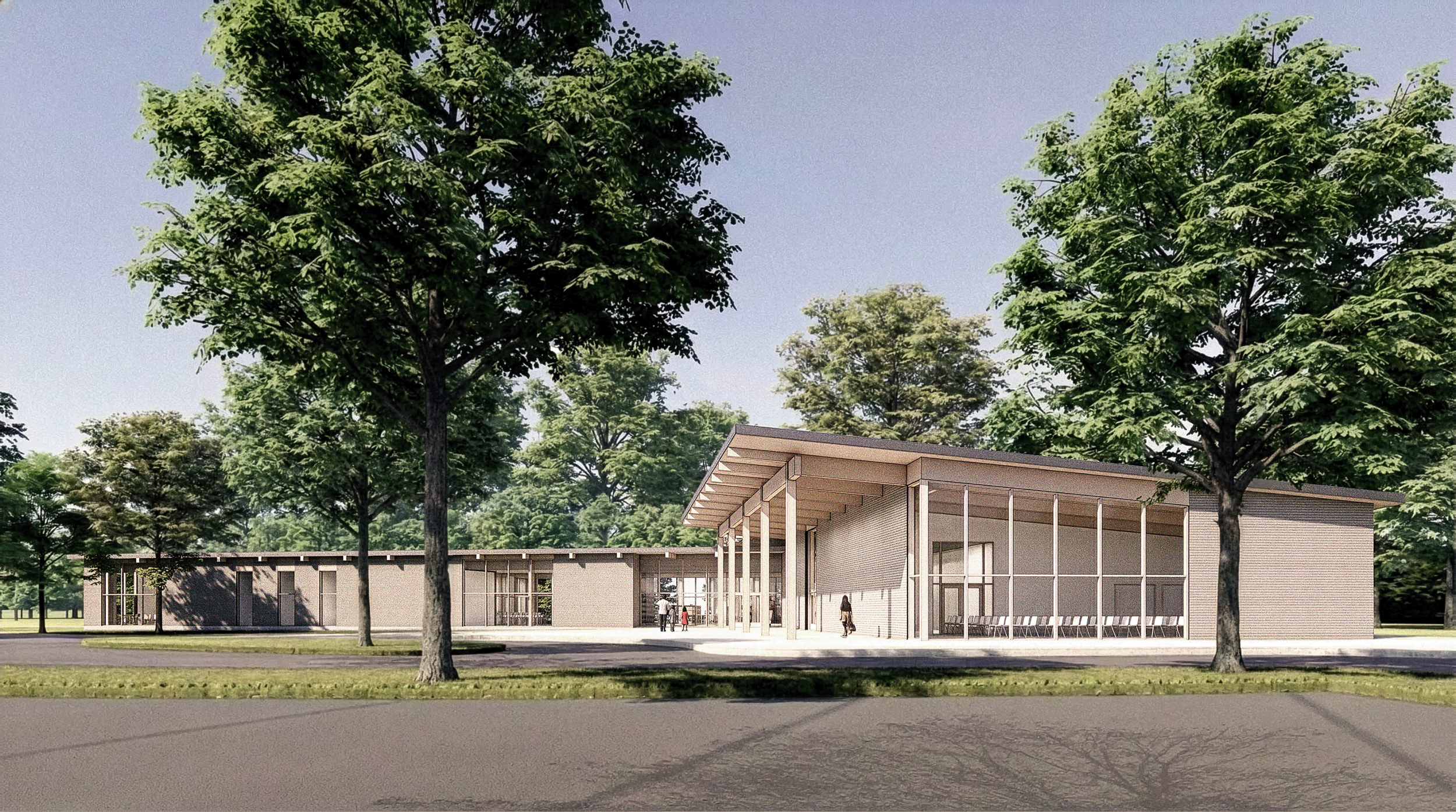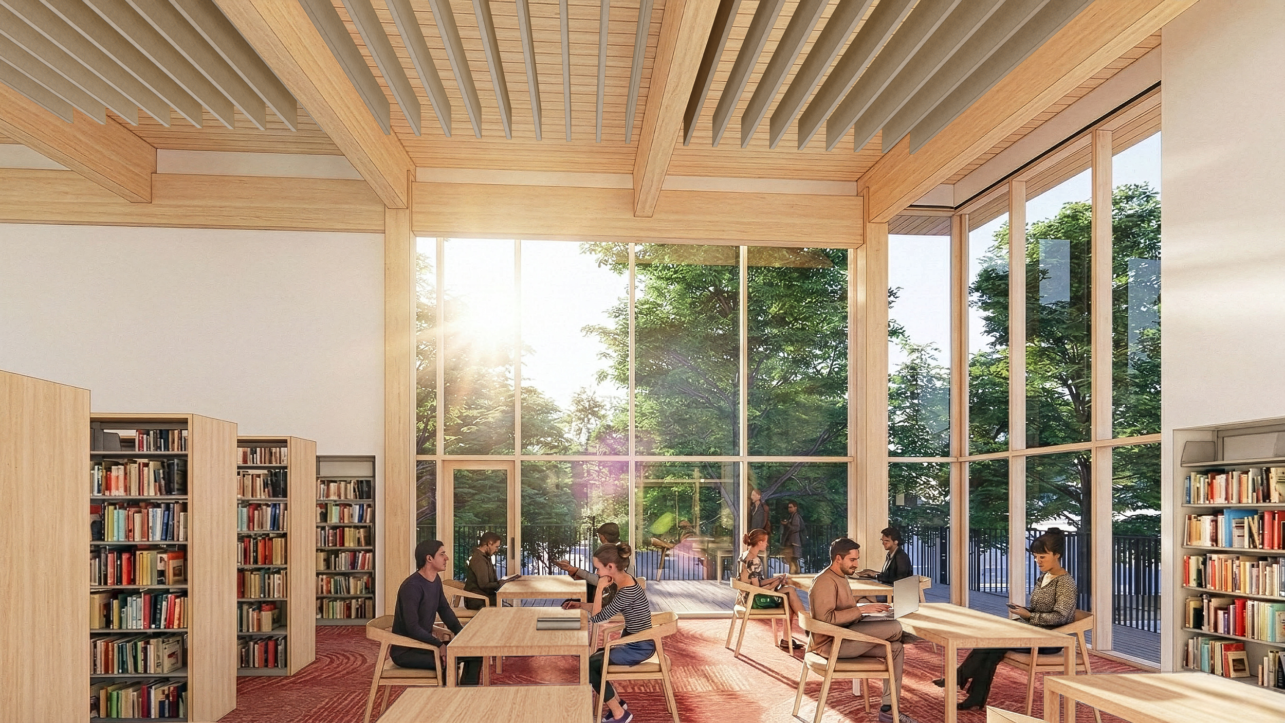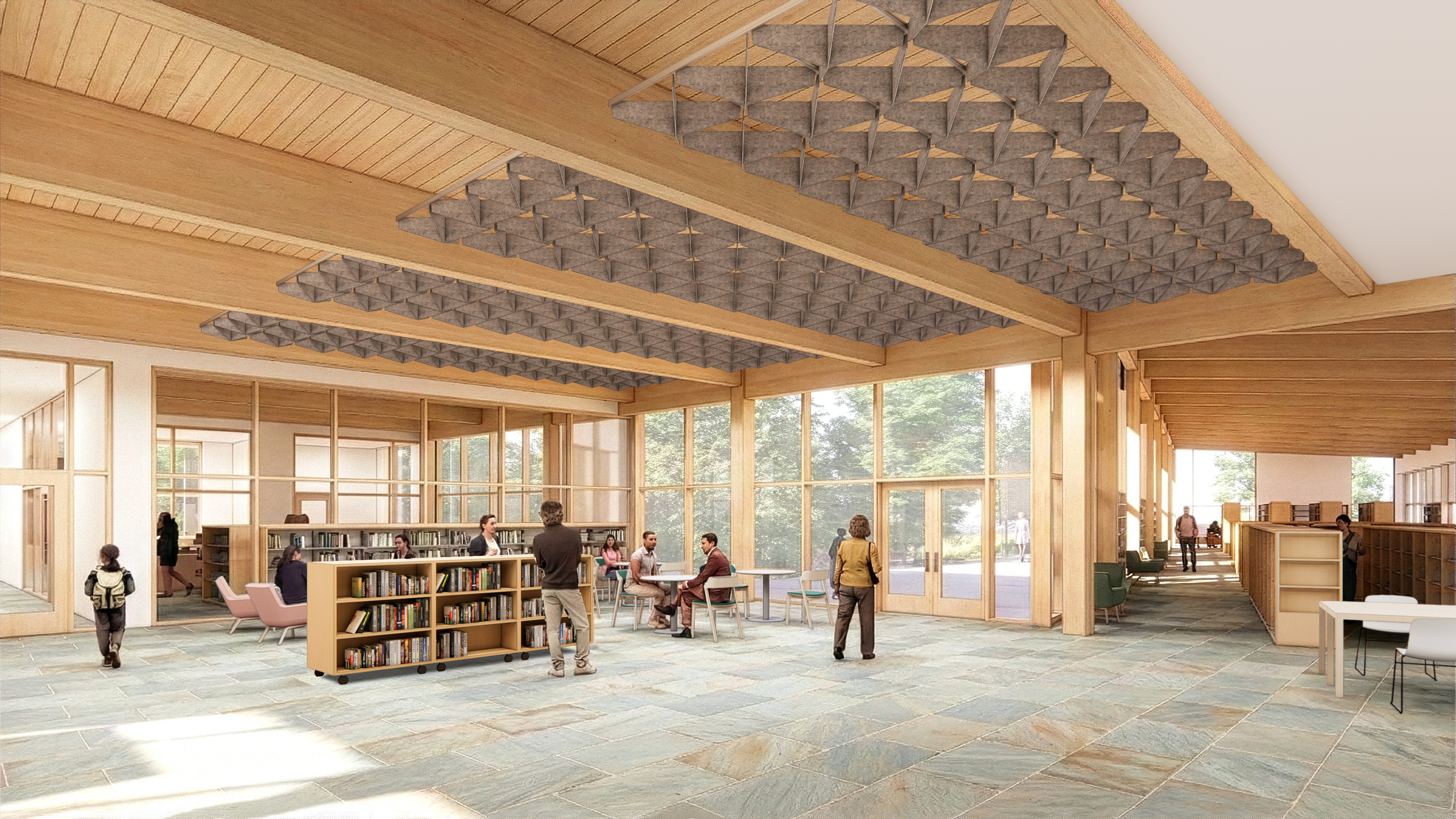 The new centrally located Yarmouth Public Library is sited strategically along an existing wooded depression, which serves as an amenity to library users and a buffer from the heavily trafficked main street. The single-story facility features an exposed mass timber structure with clear spans that maximize adaptability for evolving community needs. The building's plan centers on a welcoming central hub from which three distinct wings radiate: adult services, youth services, and community spaces. This intuitive organization ensures easy wayfinding and supports dedicated programming for children, teens, and adults, while also facilitating visual supervision by staff. Purpose-built spaces include a children's program room, teen room, STEM space, classroom, community meeting room, and multiple study/meeting rooms of varying sizes. Transparent, light-filled interiors convey a sense of openness and civic pride. The library extends to the surrounding landscape through reading porches, an entry plaza, and amphitheater-style terracing that enable flexible outdoor access and programming. Sustainability and resilience guide the facility's systems. South and east-facing roofs accommodate solar arrays to offset all-electric systems, while strategic grading and landscape buffers manage stormwater and reduce heat island effects. A backup generator powers select community spaces during emergencies, enabling the library to serve as a warming or cooling center. With universal accessibility, after-hours community space access, and strong pedestrian connections to Route 28 and Town Hall, the Yarmouth Public Library functions as a vital public resource and center of community life and activity.